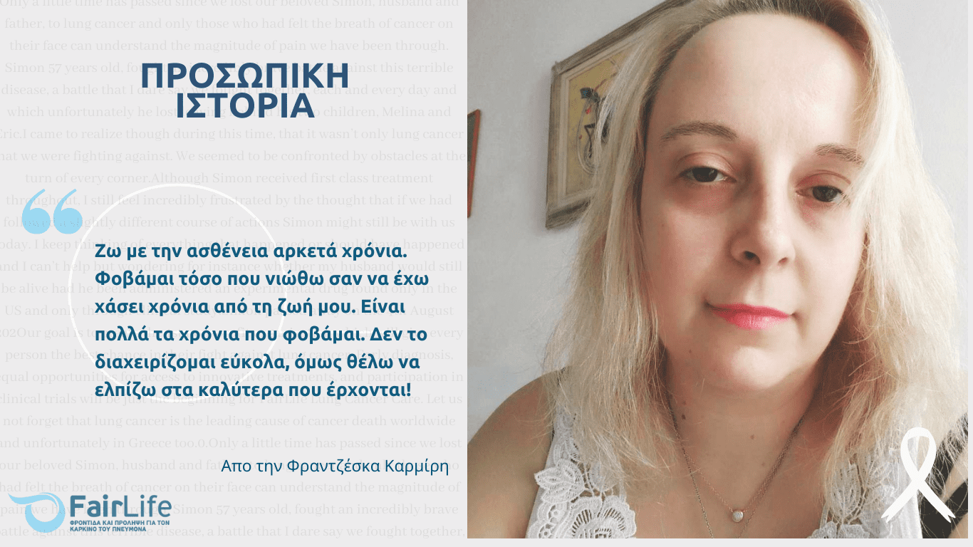 Διαβάστε περισσότεραΑπο την Φραντζέσκα Καρμίρη, Ασθενή 45 ετών Χρόνια τώρα έχω μάθει πια να ζω με τον καρκίνο. Η αρχή έγινε στα 20 μου…