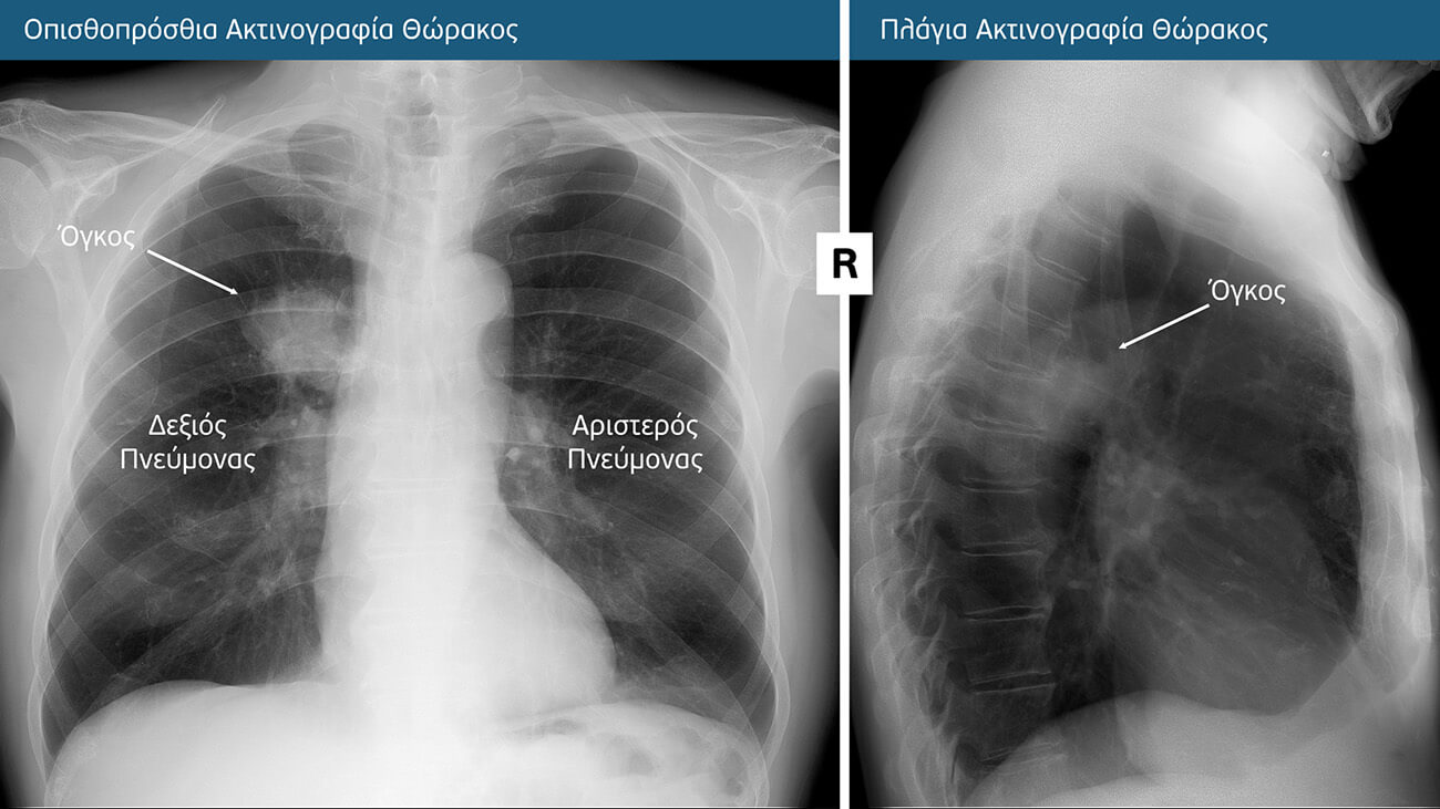 Η ακτινογραφία θώρακος είναι η απλούστερη και συχνά η πρώτη εξέταση που διενεργείται για την ανίχνευση πνευμονικών αλλοιώσεων ή όγκων, όταν υπάρχουν γενικευμένα συμπτώματα. Μπορεί επίσης κατά τύχη να αποκαλύψει πνευμονικούς όγκους ενώ διενεργείται για άσχετη αιτία. Ωστόσο, όταν η νόσος βρίσκεται στο αρχικό της στάδιο, οι ακτινογραφίες θώρακος συχνά είναι ανεπαρκείς και δεν είναι σε θέση να εντοπίσουν μικρούς καρκινικούς όζους στον πνεύμονα και γι’ αυτό όταν υπάρχει ανησυχία για καρκίνο του πνεύμονα, πρέπει ο ασθενής να υποβάλλεται σε αξονική (υπολογιστική) τομογραφία θώρακος.